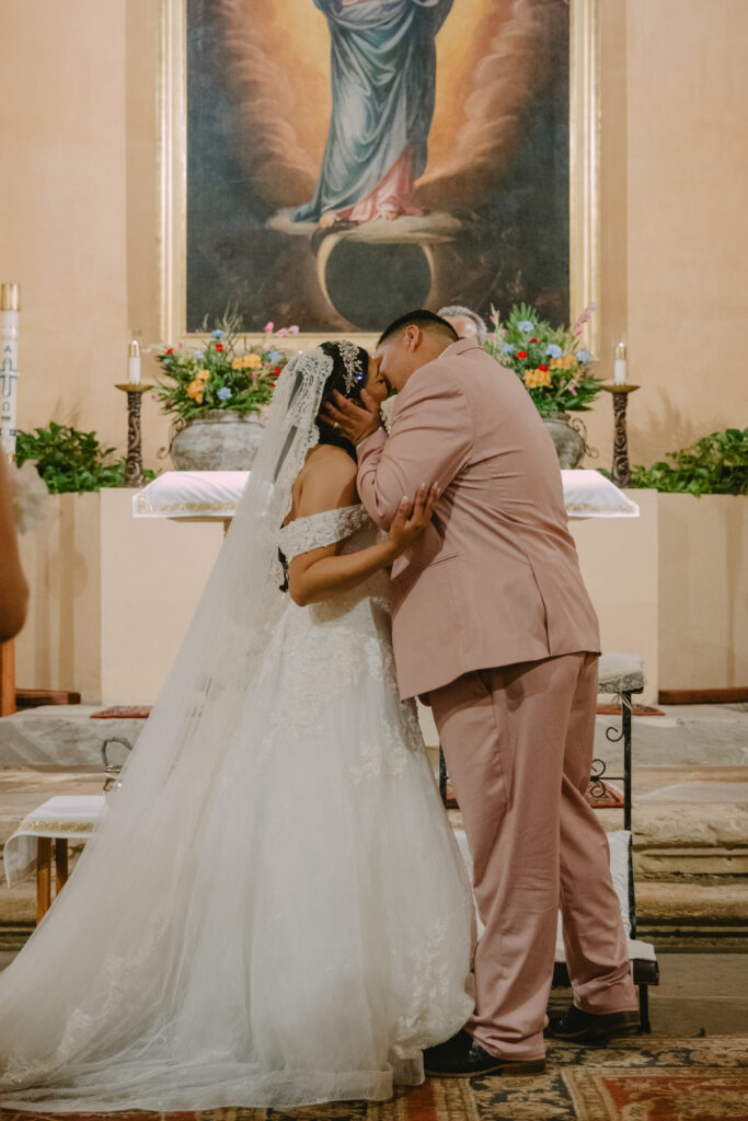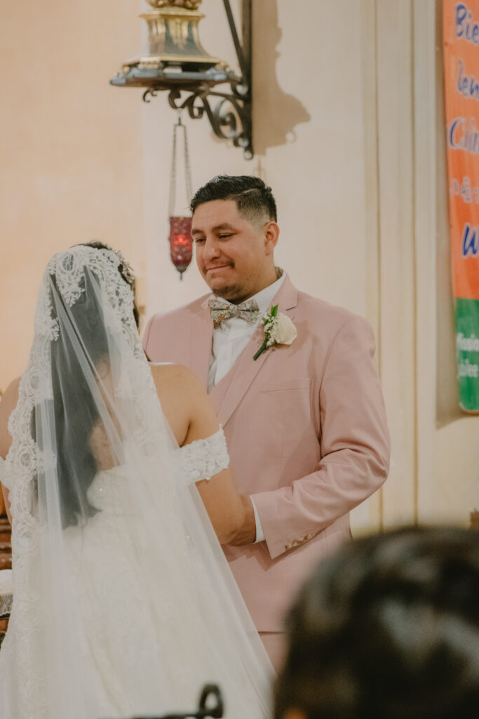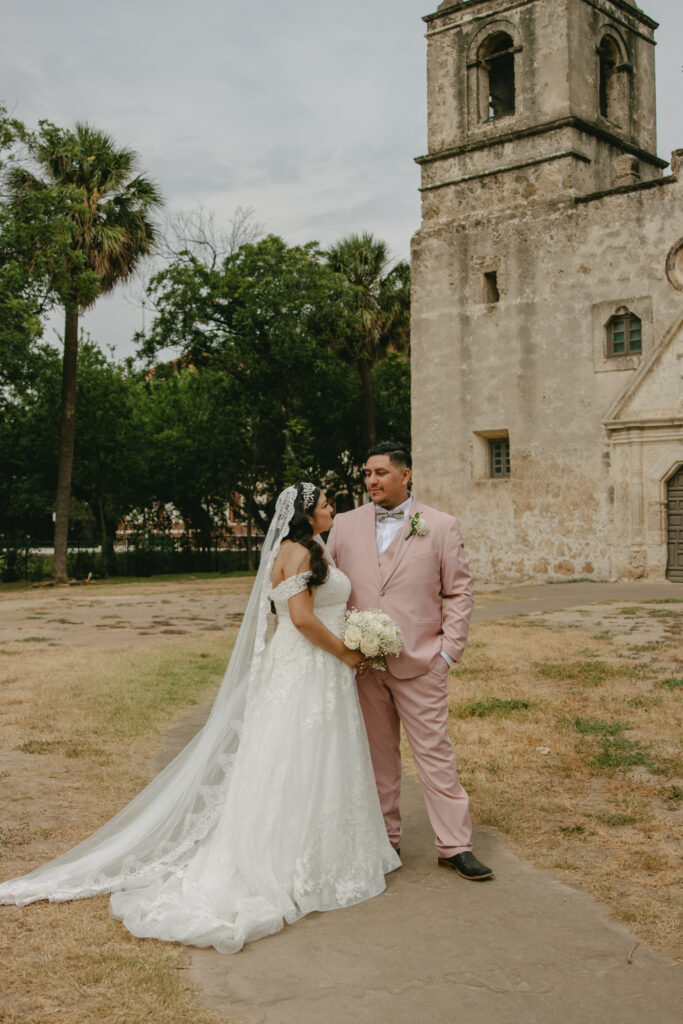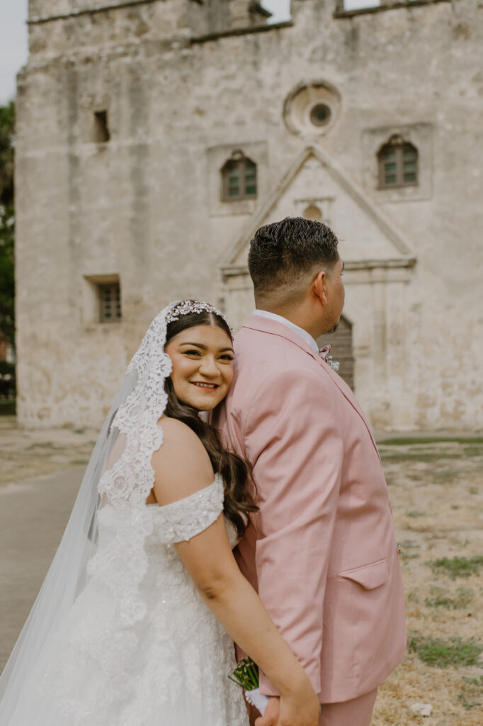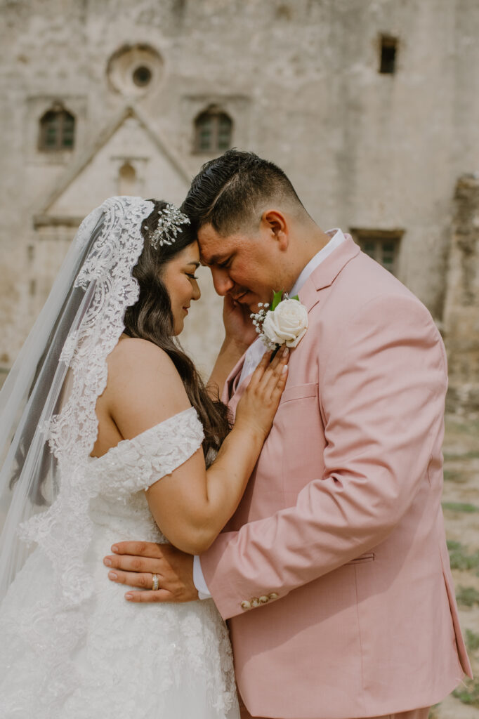 The groom’s blush pink suit was such a fun twist on tradition modern, romantic, and perfectly suited for a Texas wedding. Together, they were radiant against the mission’s warm tones and rustic stone walls.